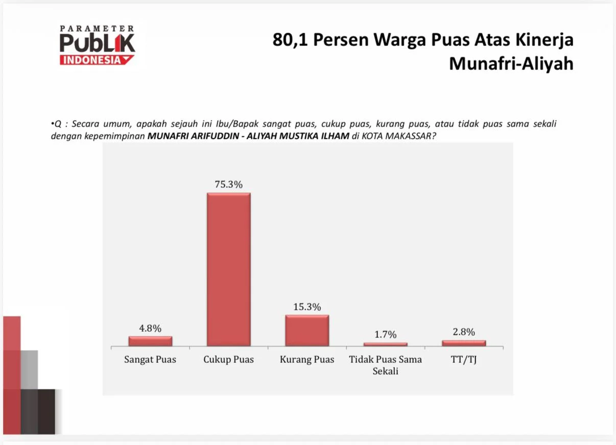 Salah satu temuan paling mencolok adalah tingkat kepuasan publik terhadap kinerja Munafri–Aliyah yang mencapai 80,1 persen.
